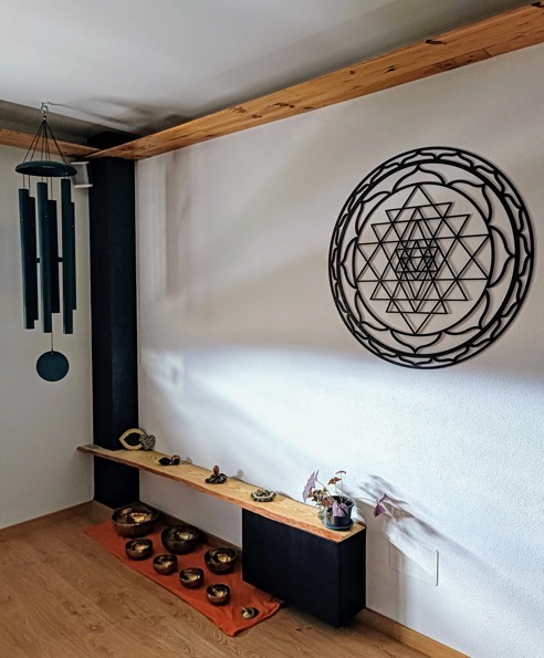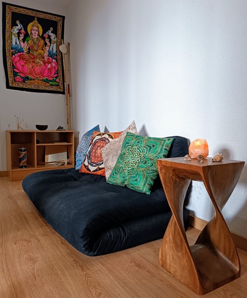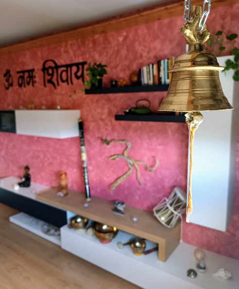 Varios altares a los cuales me postro para honrar diferentes aspectos, cualidades y prácticas. Desde el altar con figuras que representan algunas deidades, al altar con los pequeños instrumentos que te pueden acompañar en un baño de sonido, junto con los cuencos que honro en otro altar. Velas, luces, plantas, libros y algunas cosas más, completan el espacio rodeando al altar principal: un espacio preparado con mimo y cuidado para poderte acompañar. que se completan con las vistas al anillo verde de la ciudad y las bonitas puestas de sol que, según el momento del día que elijas, tal vez puedas disfrutar.